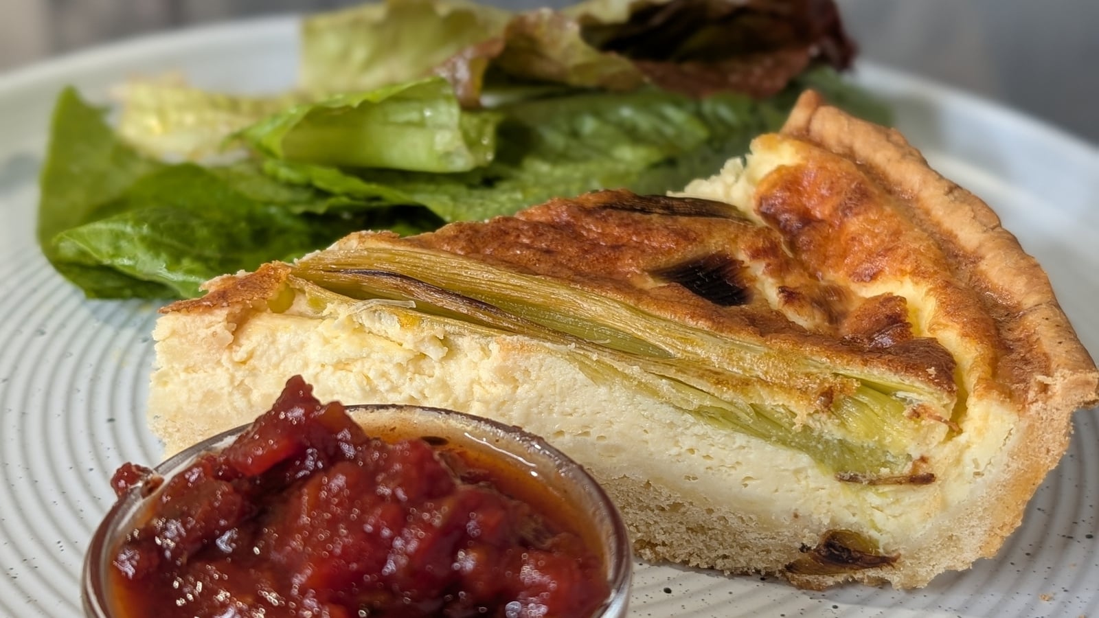 Эта запечённая квиш с пореем и чеддером подаётся со свежим салатом и заправкой на яблочном уксусе, и она невероятно сытна как обед или лёгкий ужин.